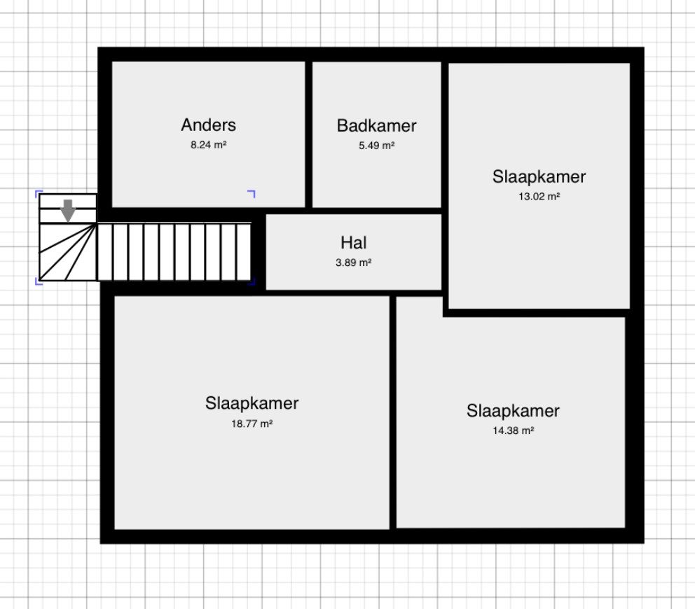 1e verdieping woning: nachthal (± 3,9 m²), slaapkamer 3 (± 18,8 m²), slaapkamer 4 (± 14,4m²), slaapkamer 5 (± 13 m²), badkamer (± 5,5 m²) en berging (± 8,2 m²).