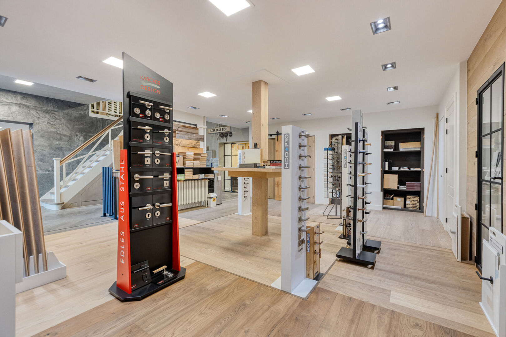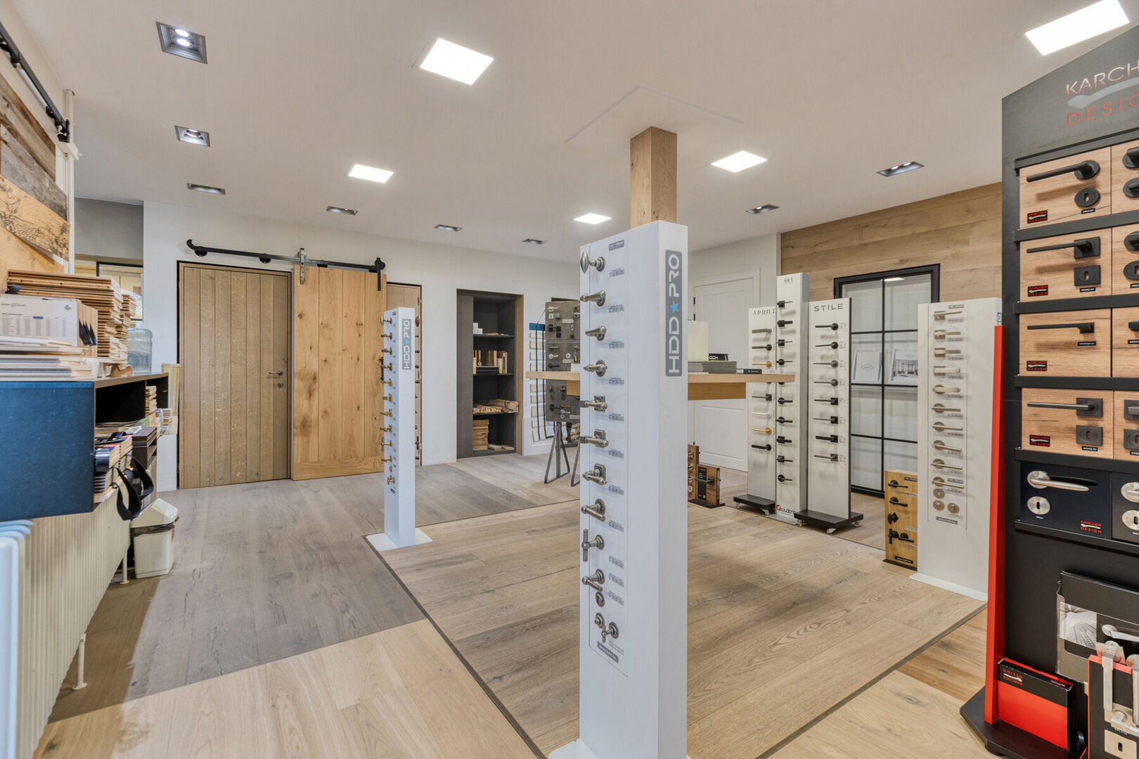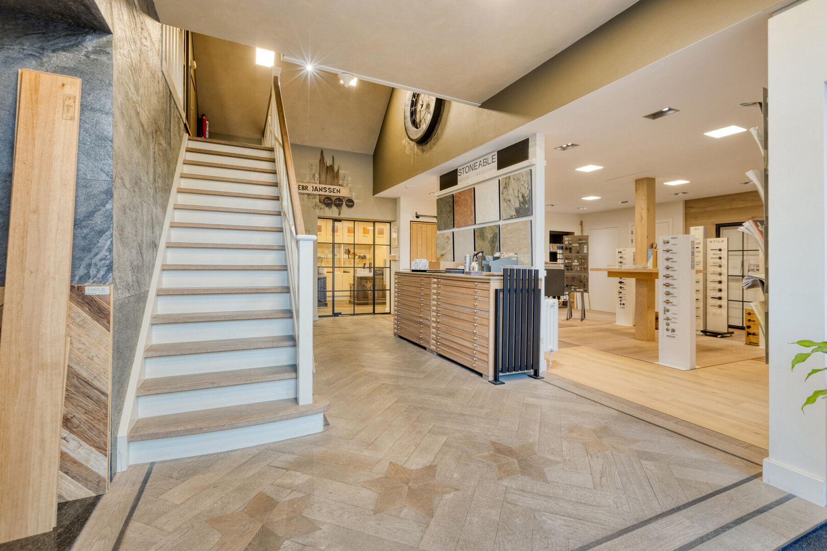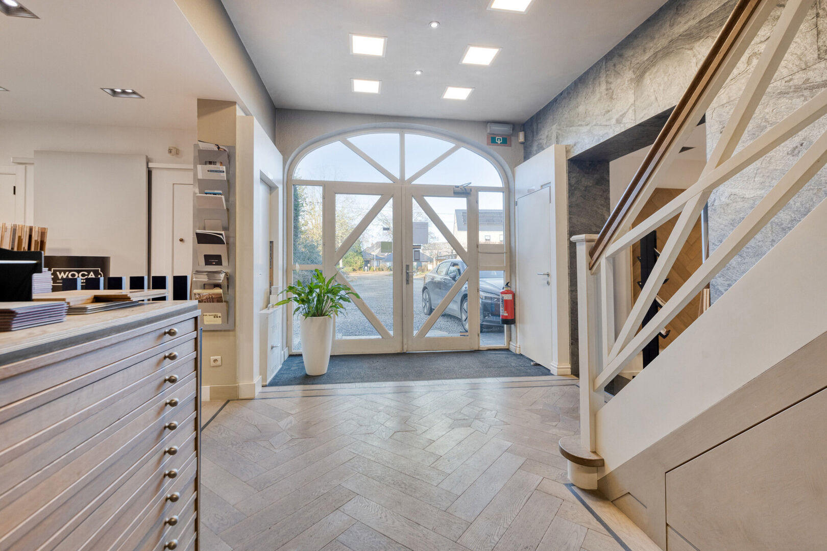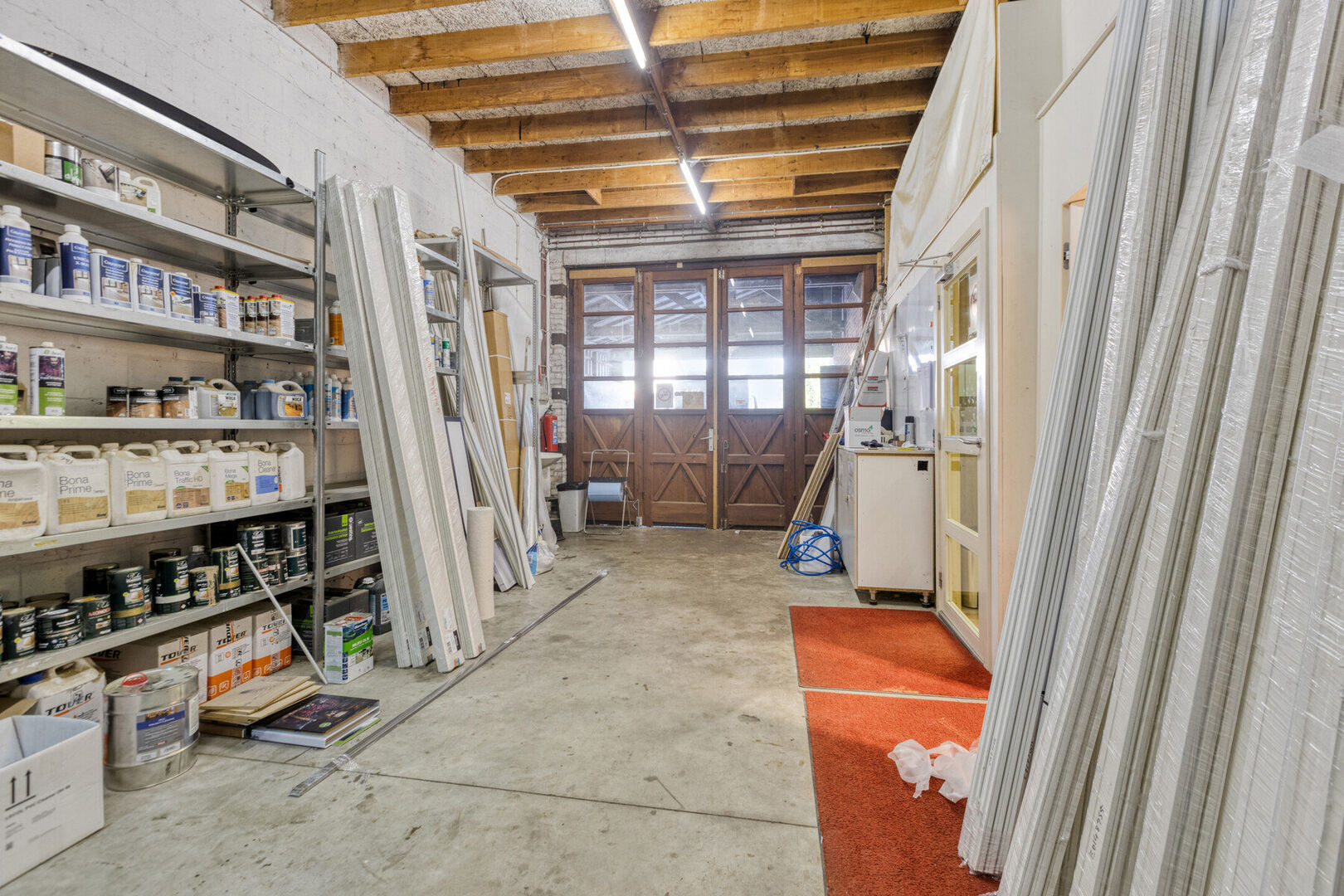 Aan voorzijde van het gebouw bereik je via de aangelegde inrit de ruime parkeergelegenheid. De veelzijdige bedrijfsruimte is uitstekend uitgerust met op het gelijkvloers een statige toonzaal, bureel, kitchenette, toilet. Ook beschik je hier over verschillende bedrijfshallen/magazijnen met een totale oppervlakte van ca. 450 m². Op de 1e verdieping vind je een kantoortuin en extra bergruimte.