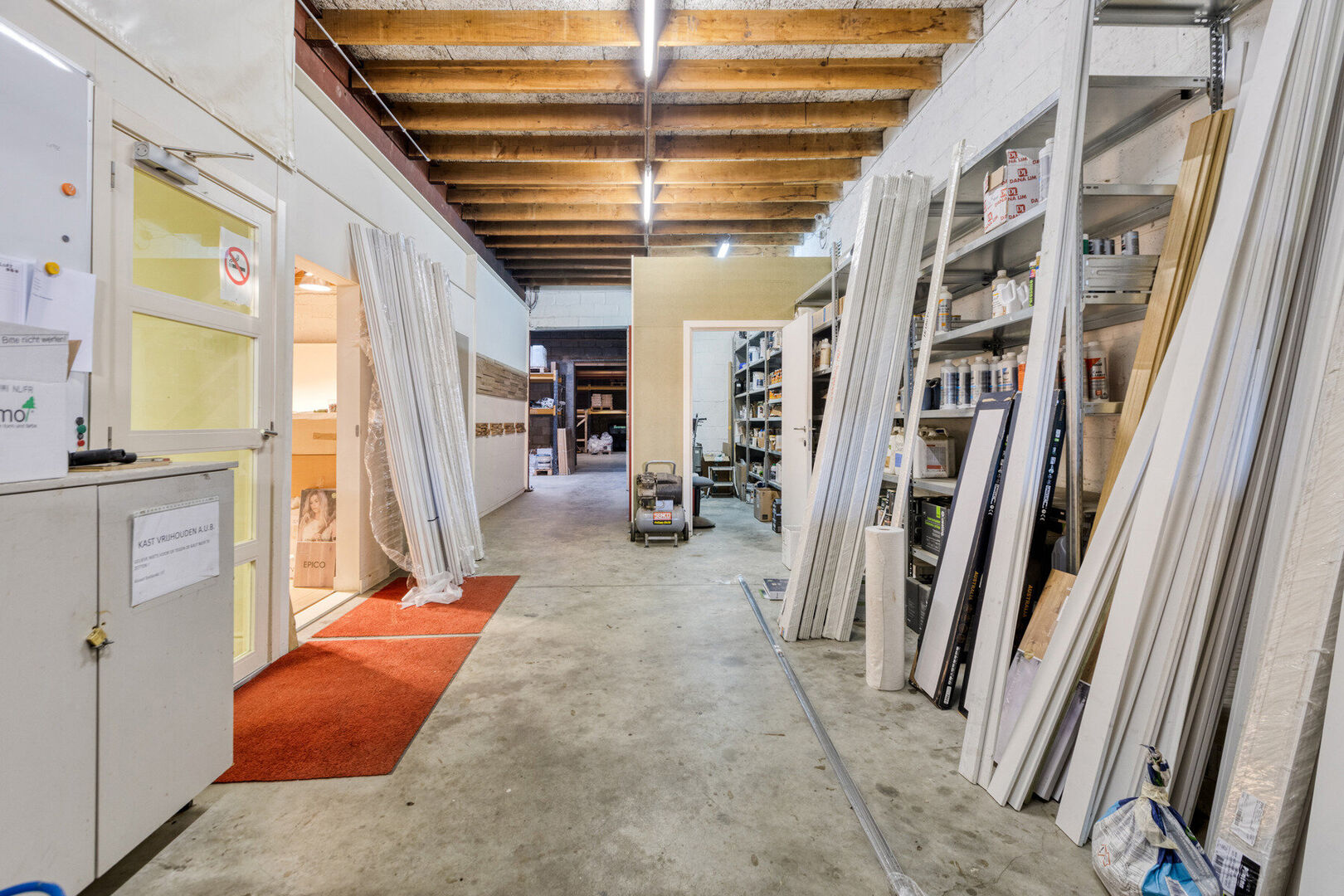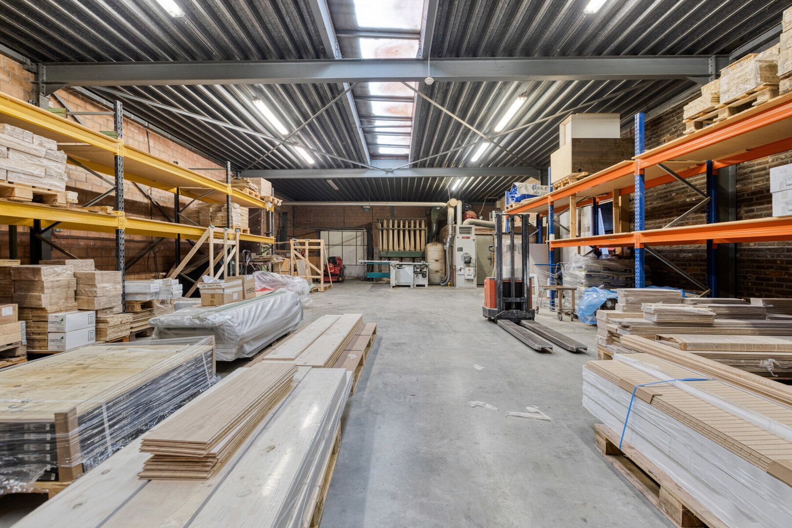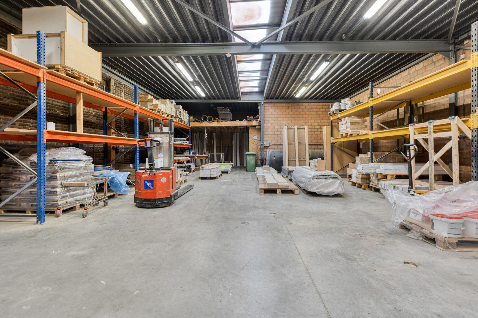 Gelijkvloers handelszaak: toonzaal met gedeelte inkom (± 23,6 m²) en 2 open ruimtes (± 42,5 m² en ± 49,7 m²), toilet (± 3,2m²), bureau (± 19,2 m²), kitchenette (± 10,3 m²), bedrijfshal 1 (± 34,8m²), opslagruimte 1 (± 8 m²), opslagruimte 2 (± 45,6 m²), magazijn (± 64,5m²), bedrijfshal 2 (± 209,8 m²) en bedrijfshal 3 (± 90,7 m²) met sectionaal poort.