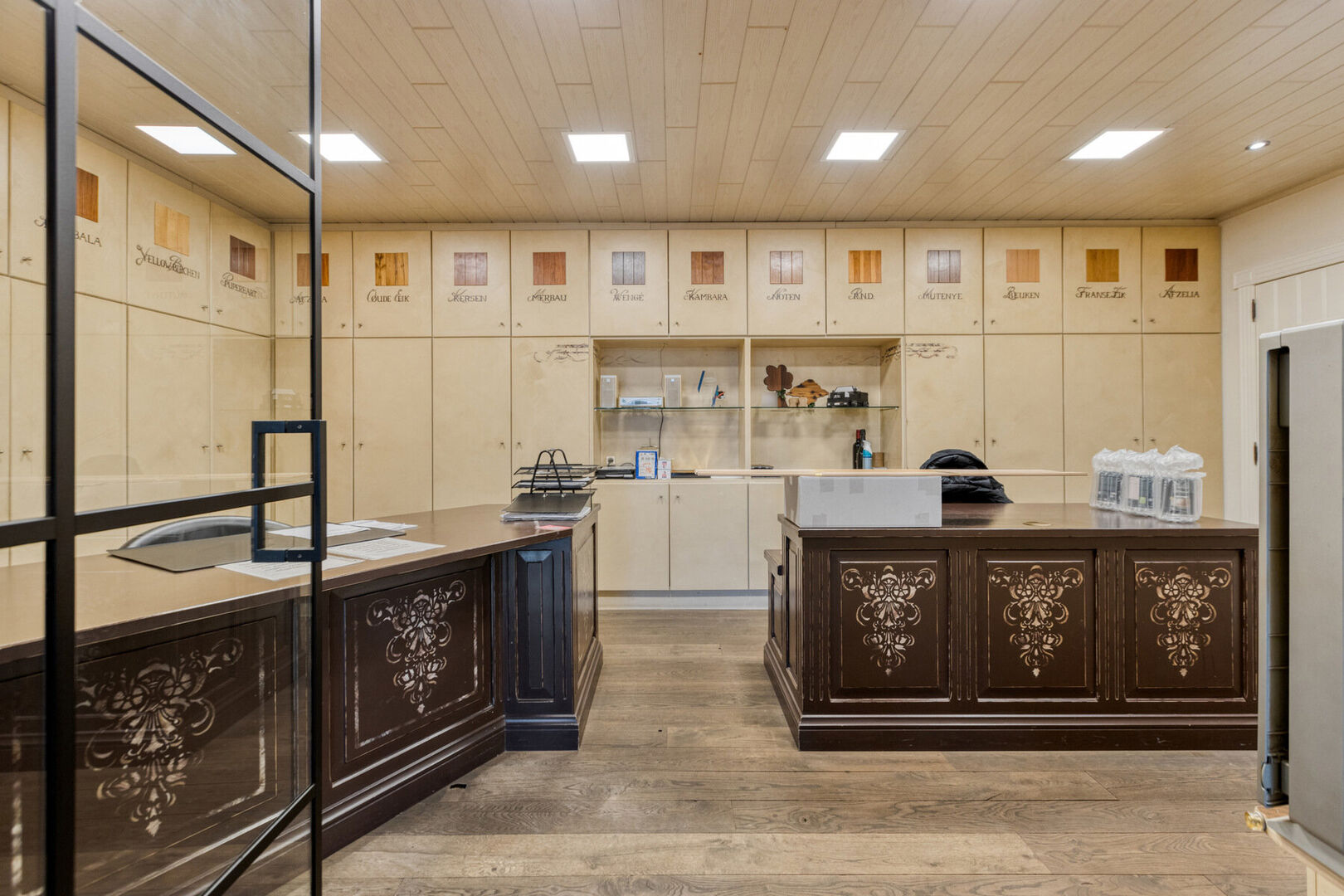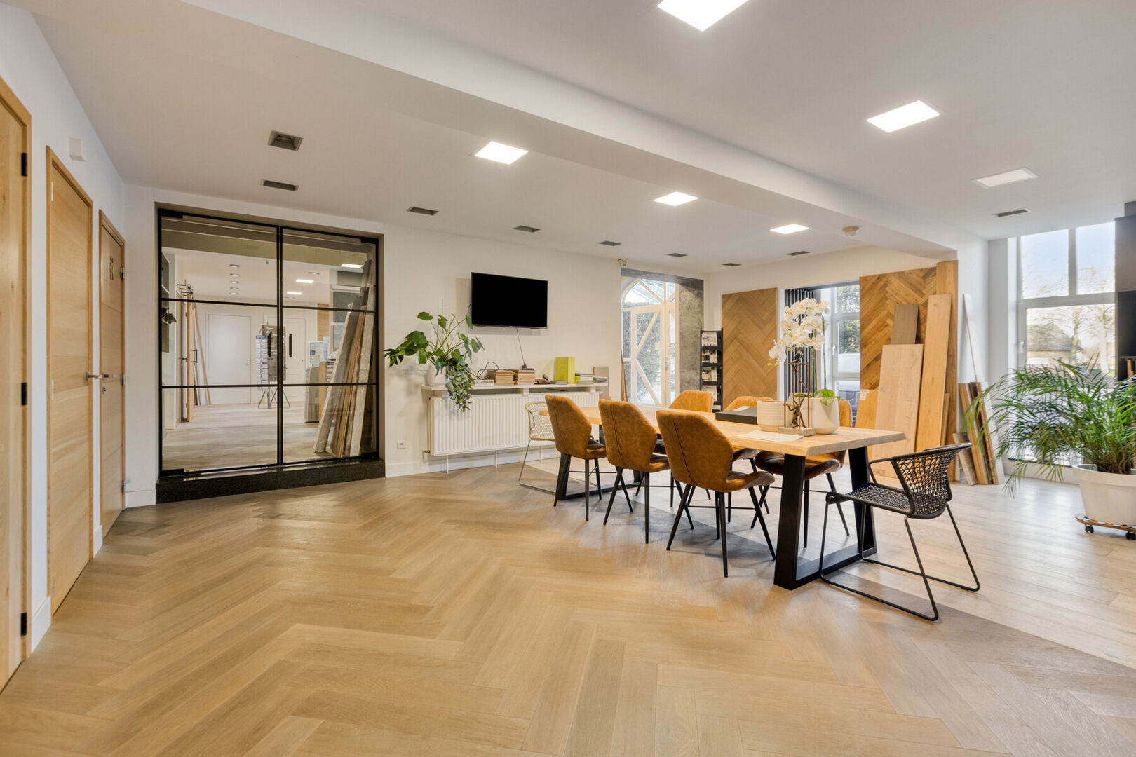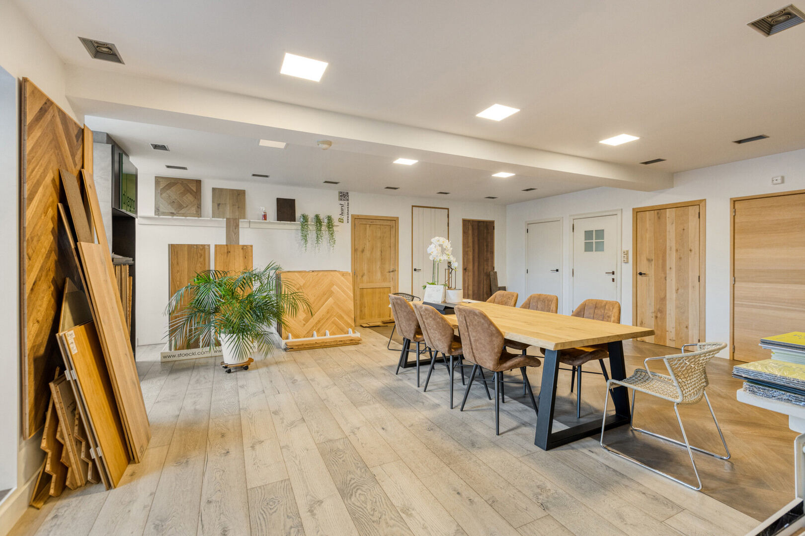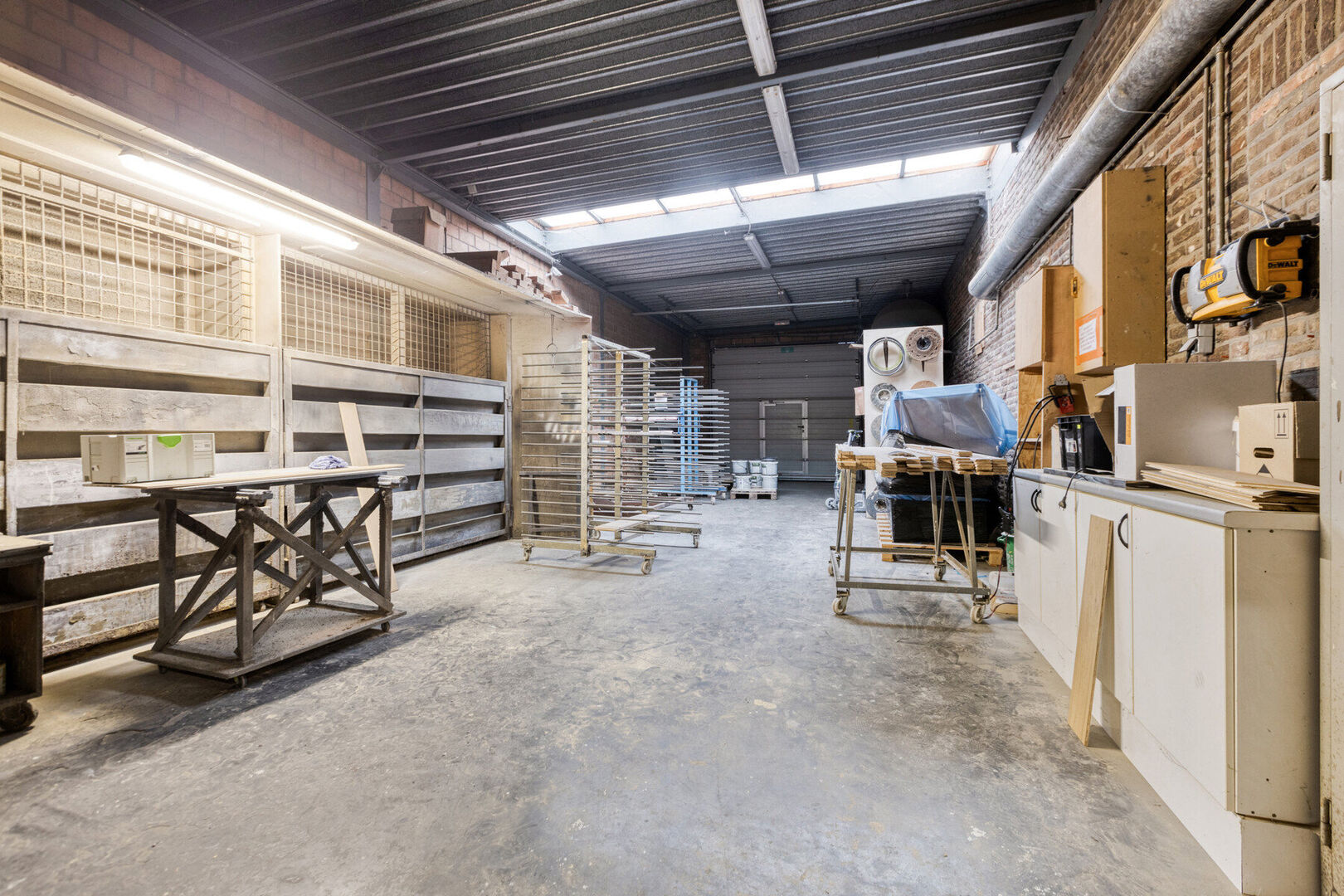 Gelijkvloers handelszaak: toonzaal met gedeelte inkom (± 23,6 m²) en 2 open ruimtes (± 42,5 m² en ± 49,7 m²), toilet (± 3,2m²), bureau (± 19,2 m²), kitchenette (± 10,3 m²), bedrijfshal 1 (± 34,8m²), opslagruimte 1 (± 8 m²), opslagruimte 2 (± 45,6 m²), magazijn (± 64,5m²), bedrijfshal 2 (± 209,8 m²) en bedrijfshal 3 (± 90,7 m²) met sectionaal poort.