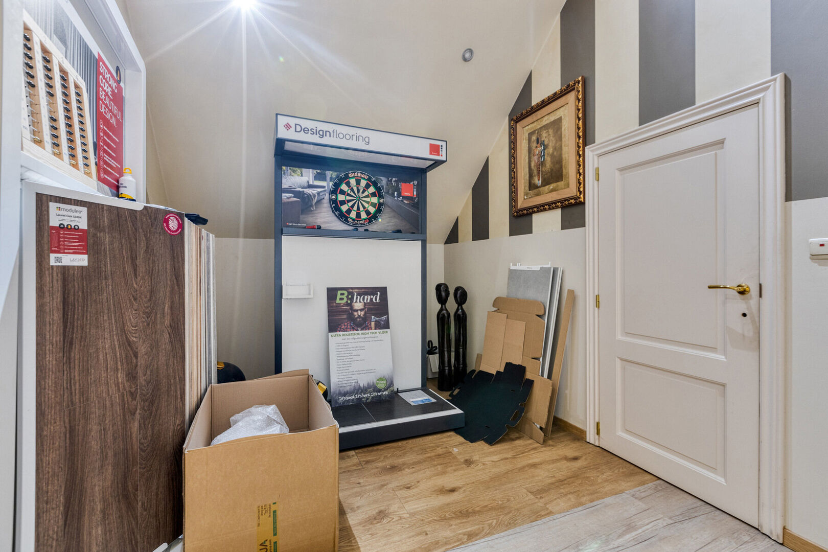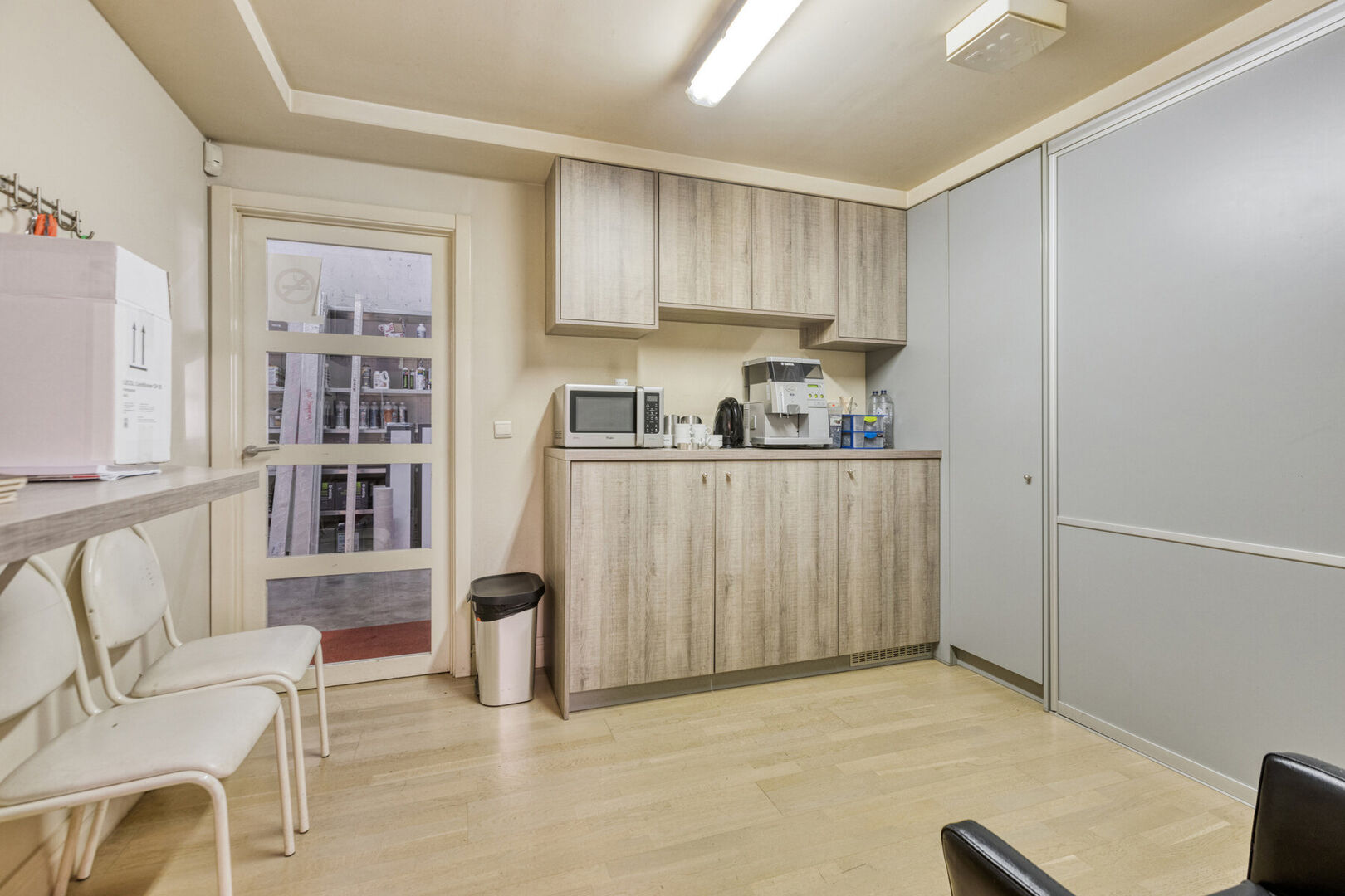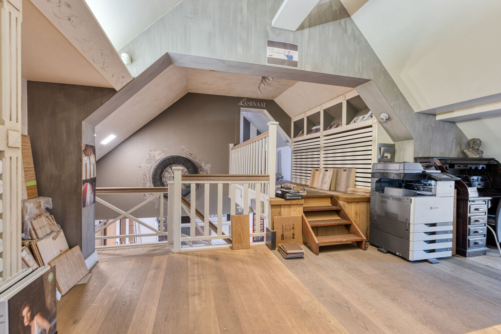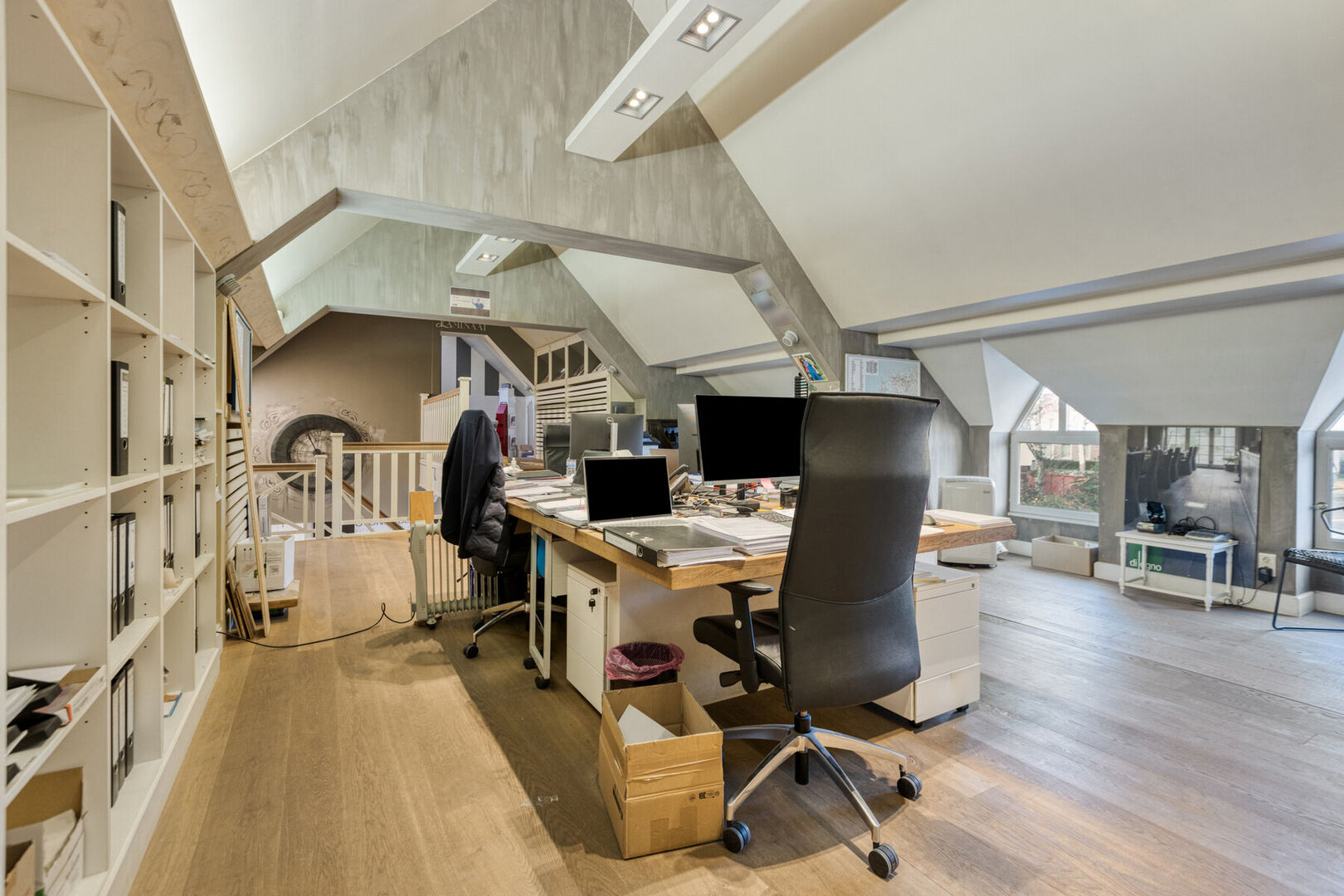 1e verdieping handelszaak: bureel (± 62,7 m²), overloop (± 5,8 m²), bergruimte (± 15,6 m²) en zolderruimte.