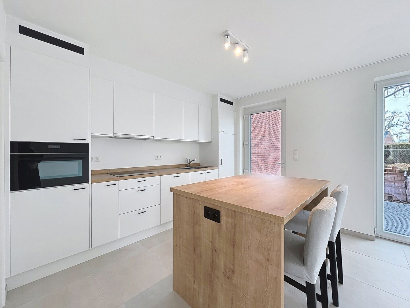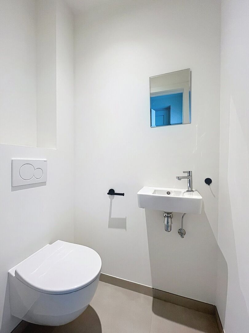 Op het gelijkvloers bevinden zich een apart gastentoilet, een ruime woonkamer met open keuken en een praktische berging/wasplaats. De keuken is volledig uitgerust met inductiekookplaat, vaatwasser, combi-oven, spoelbak, koelkast én een handig eiland. De woonkamer baadt in het licht dankzij aanwezigheid van de schuifpui die toegang geeft tot het terras met tuintje. In de volledig omheinde tuin vind je ook een tuinberging. Op de eerste verdieping bevinden zich dan weer 3 comfortabele slaapkamers en een knusse badkamer.