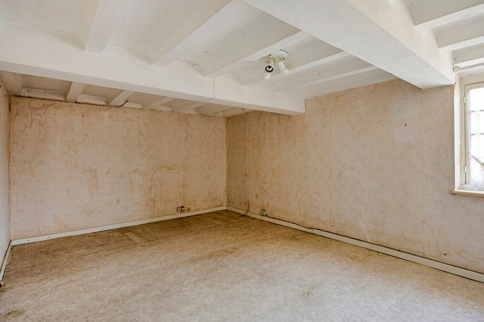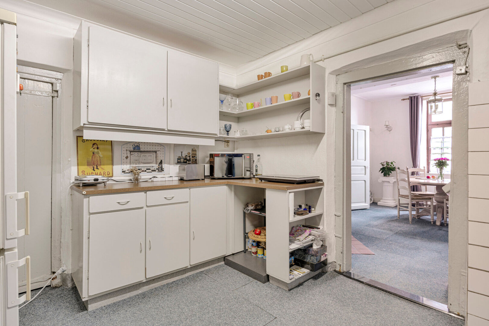 Gelijkvloers: berging met toegang tot bijgebouw, keuken met onder- en bovenkasten en spoeltafel, leefruimte.