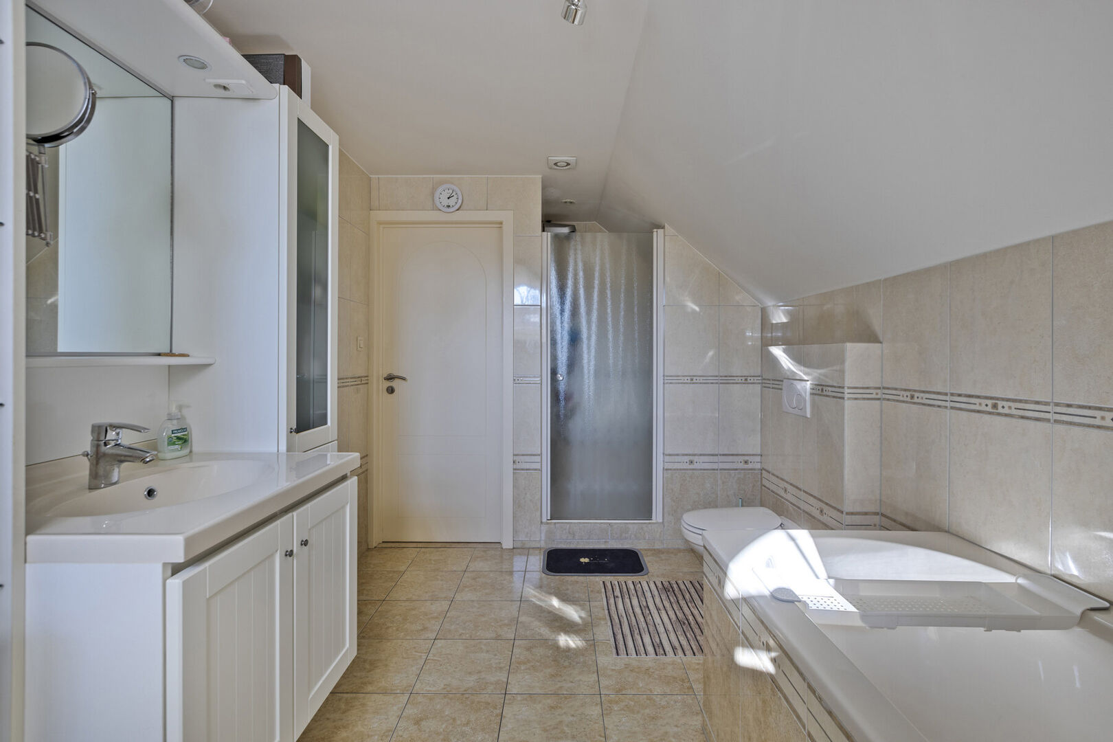 Het gelijkvloers is volledig uitgerust met elektrische rolluiken. De centrale verwarming is op aardgas via vloerverwarming, en de woning is verder voorzien van zonnepanelen, een opslagbatterij, elektrische boiler en airconditioning — wat bijdraagt aan een hoge energie-efficiëntie en comfort.